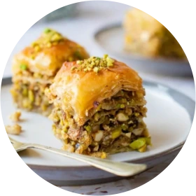 Baklava is a rich and sweet pastry made of crispy layers of filo dough filled with a mixture of nuts and sweetened with syrup or honey, offering a perfect crunchy and sugary delight.
